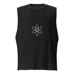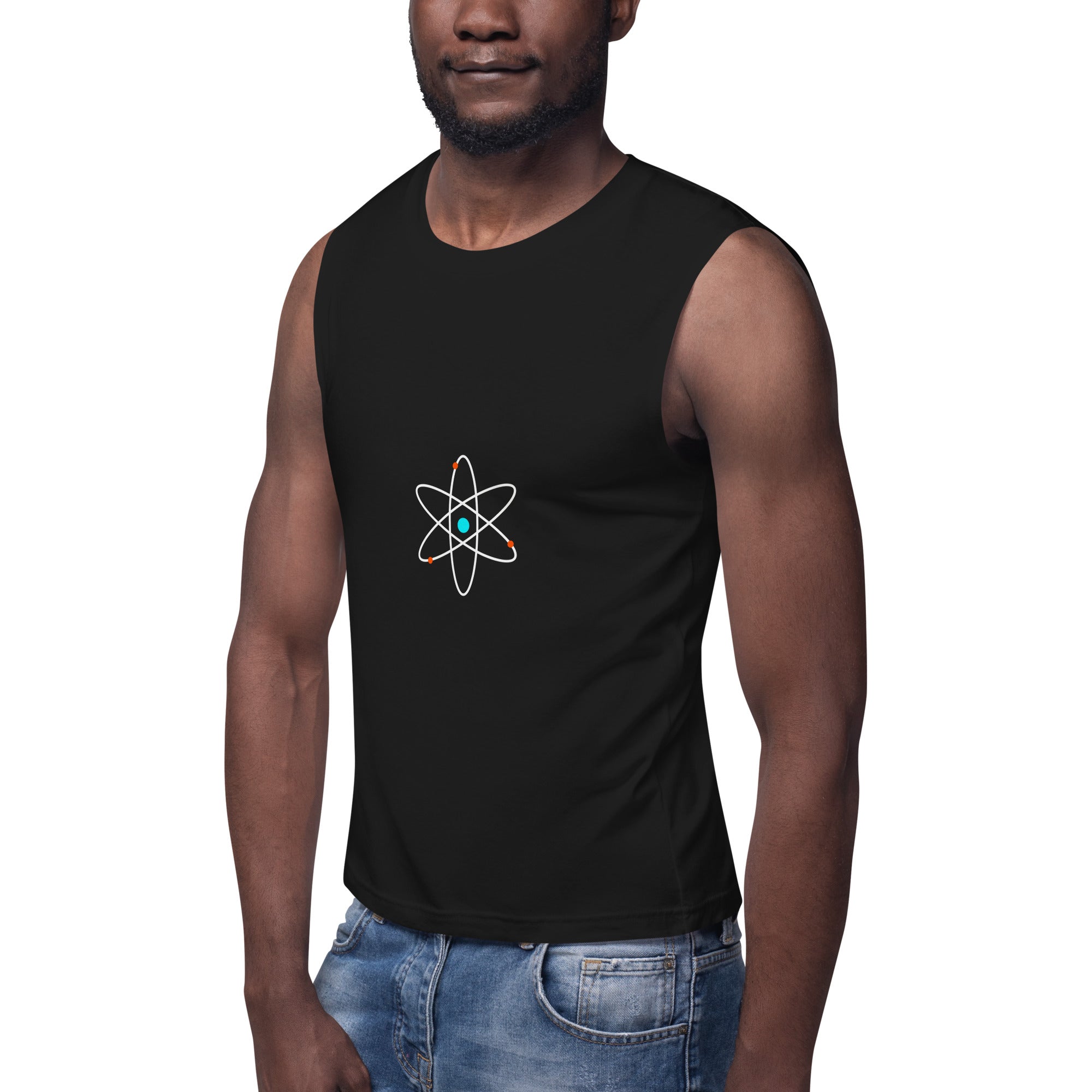 Un t-shirt sans manches (aussi appelé débardeur) noir épuré, frappé d’un atome blanc central ⚛️.
