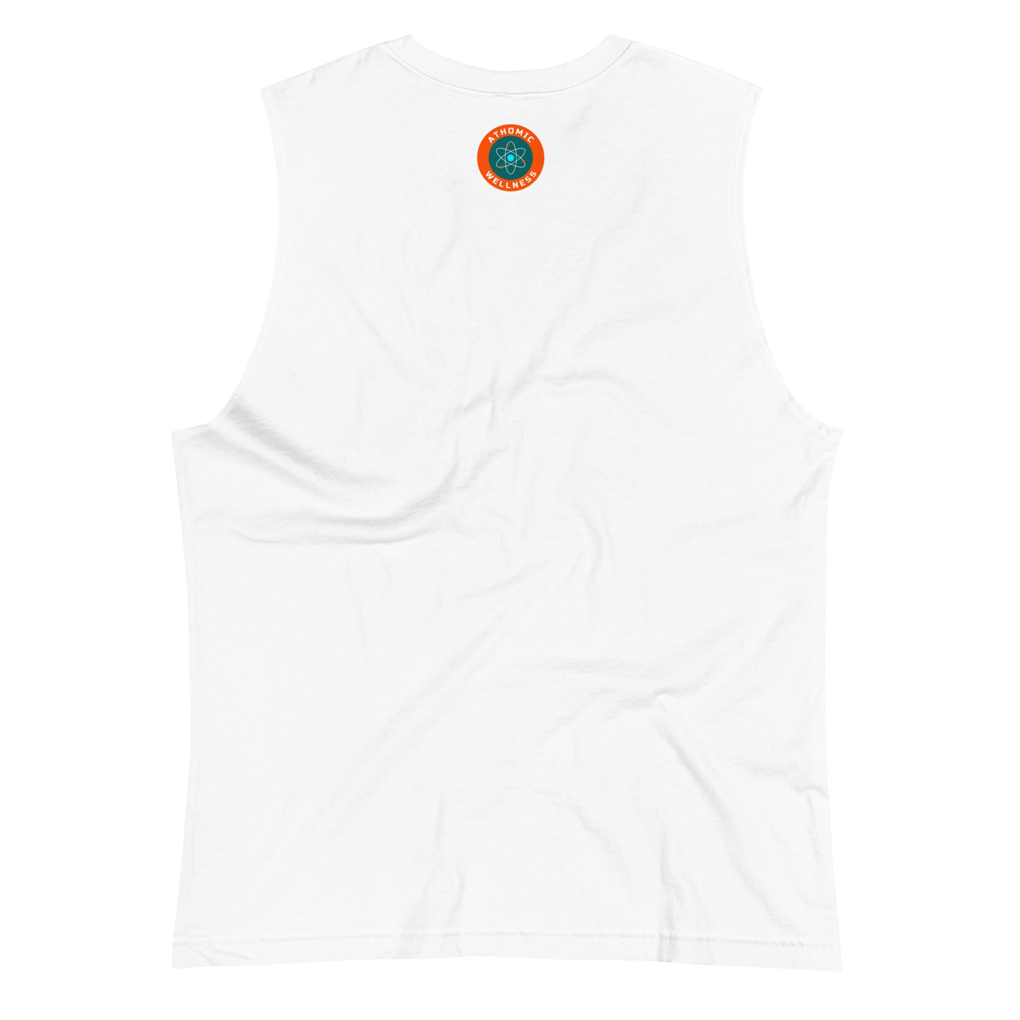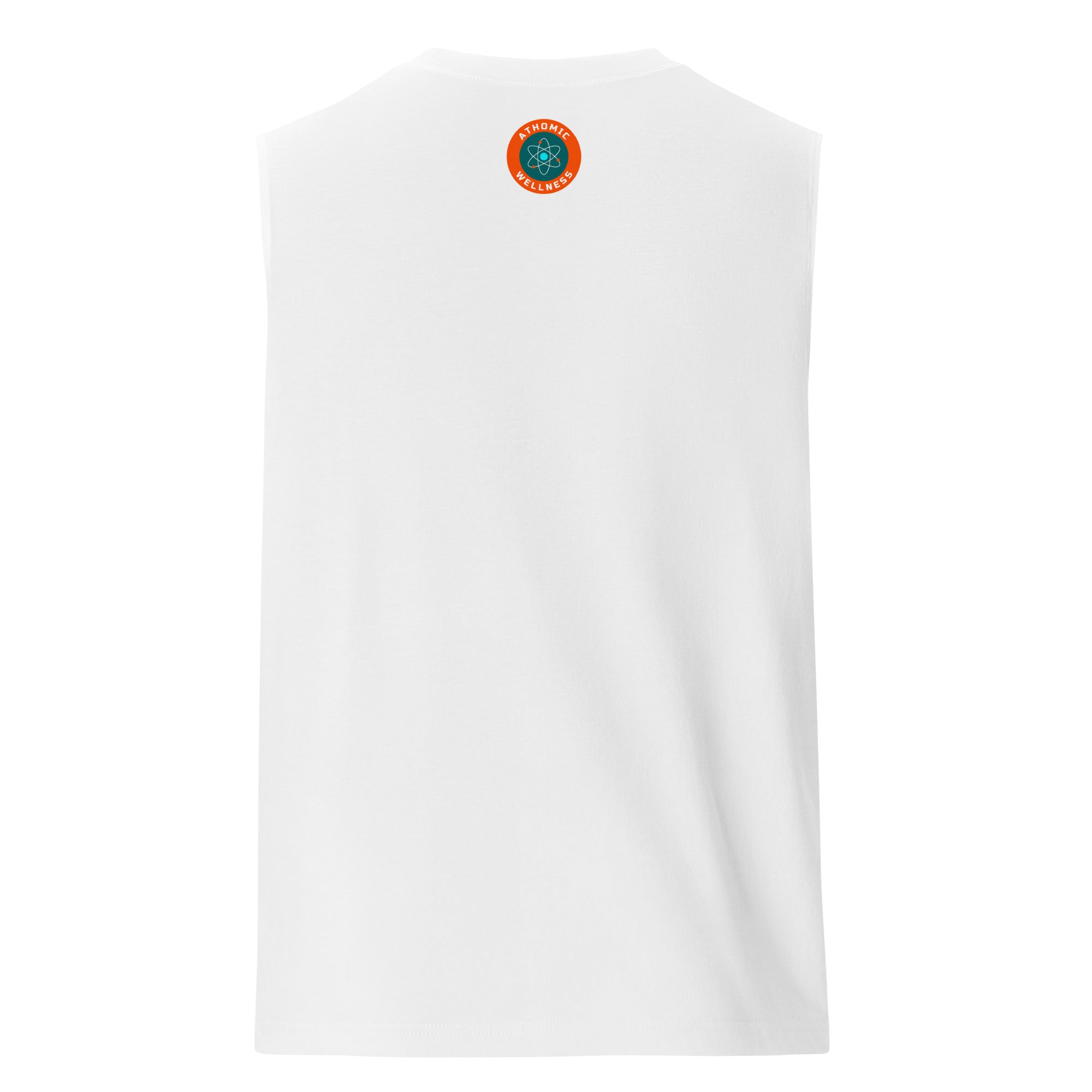Débardeur homme blanc motif coloré avec design atomique porté par homme musclé Athomic Wellness