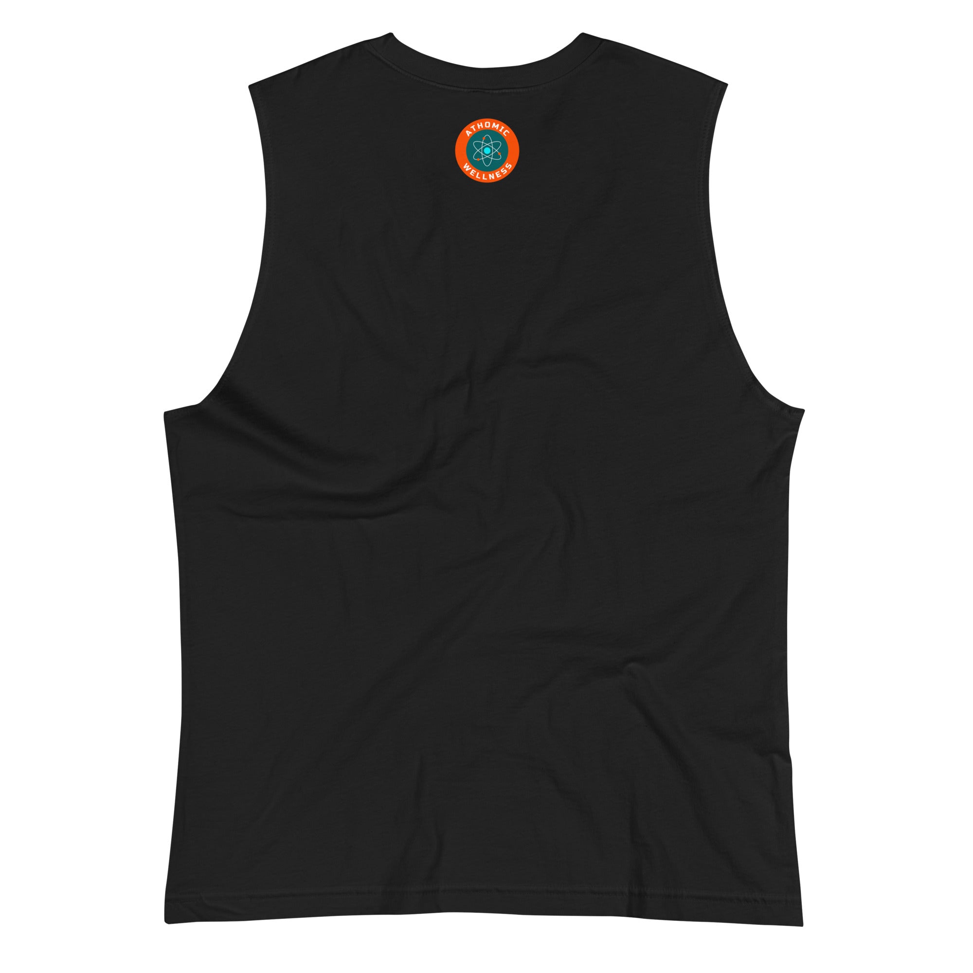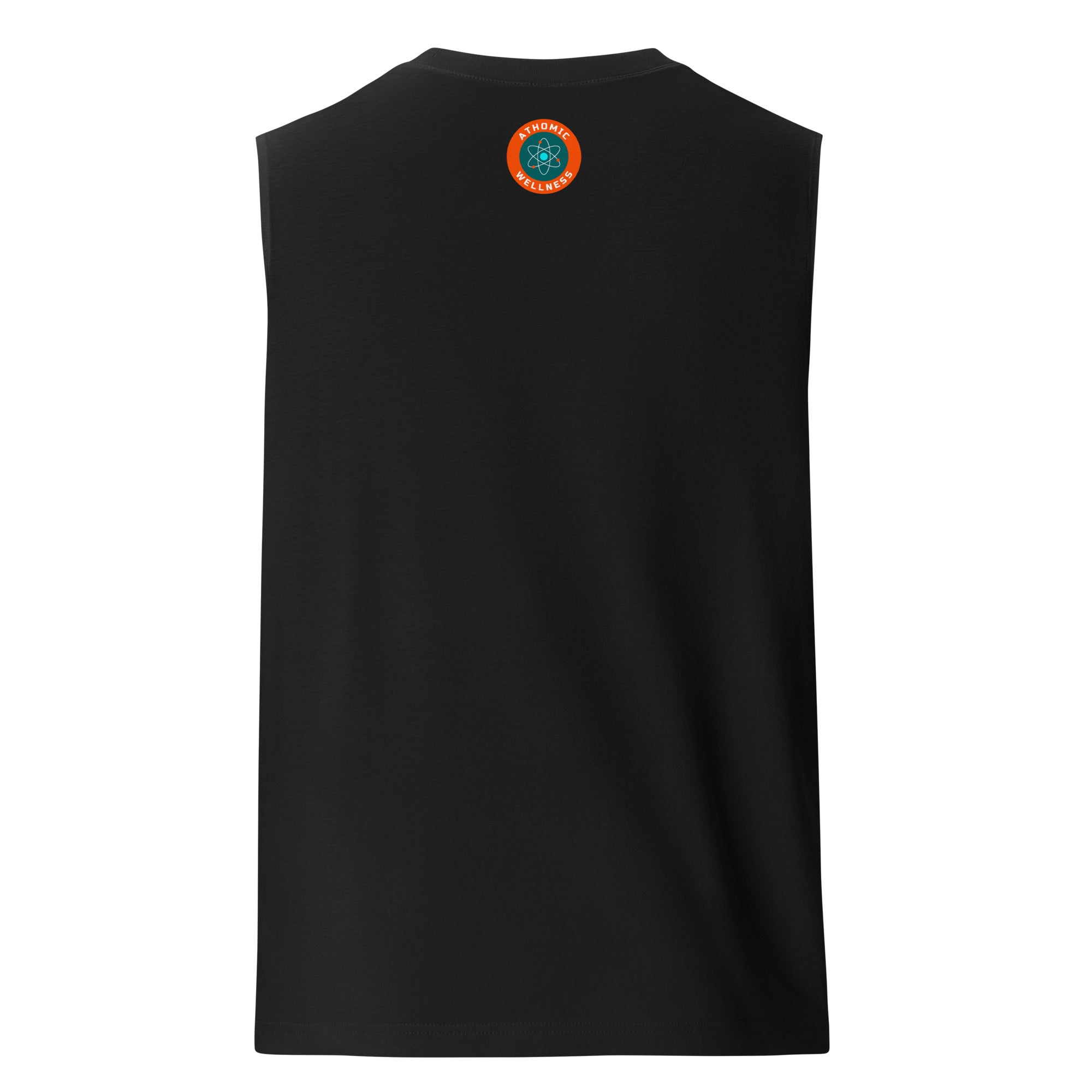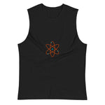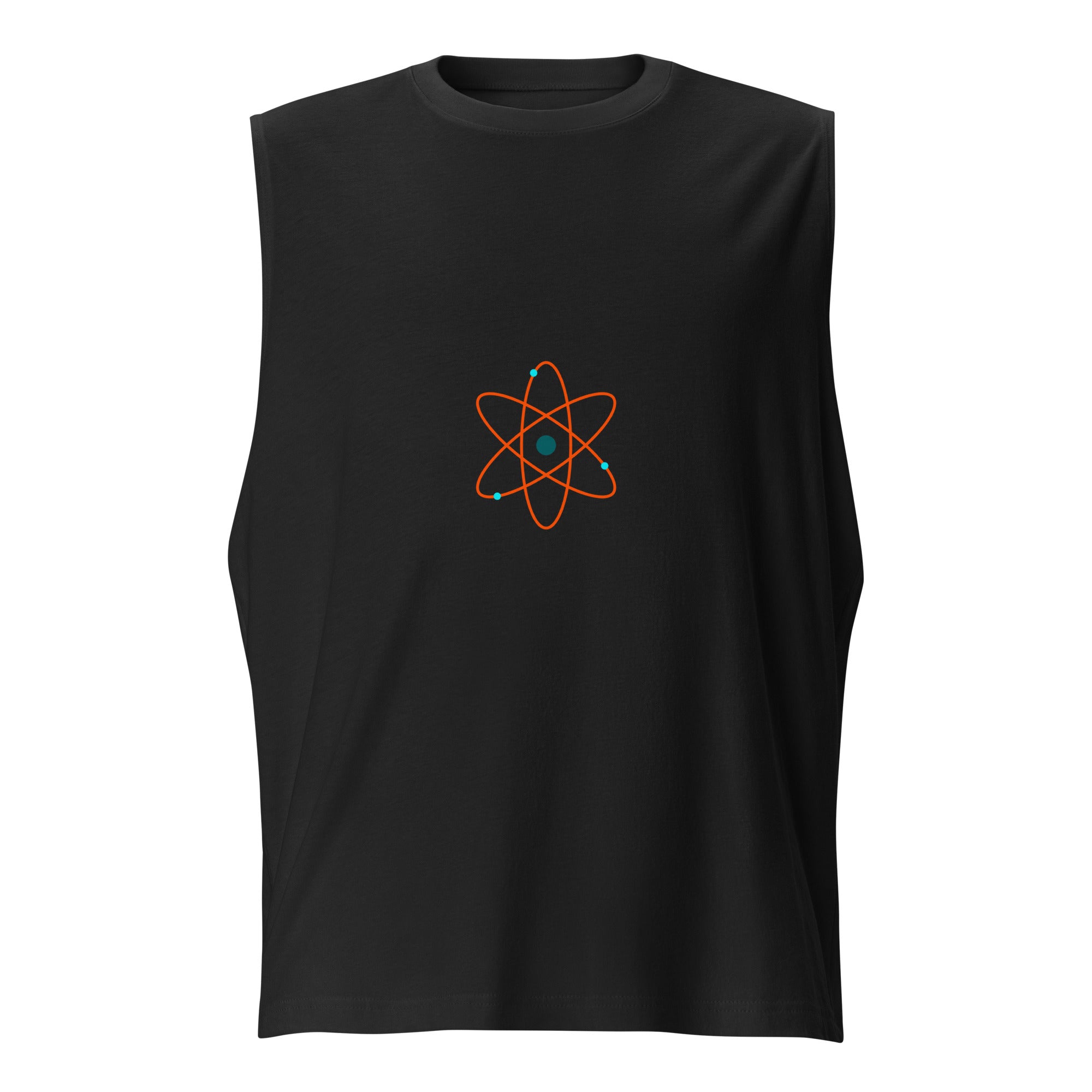 Un t-shirt sans manches (ou débardeur) noir percutant, marqué d’un atome orange vibrant ⚛️.
