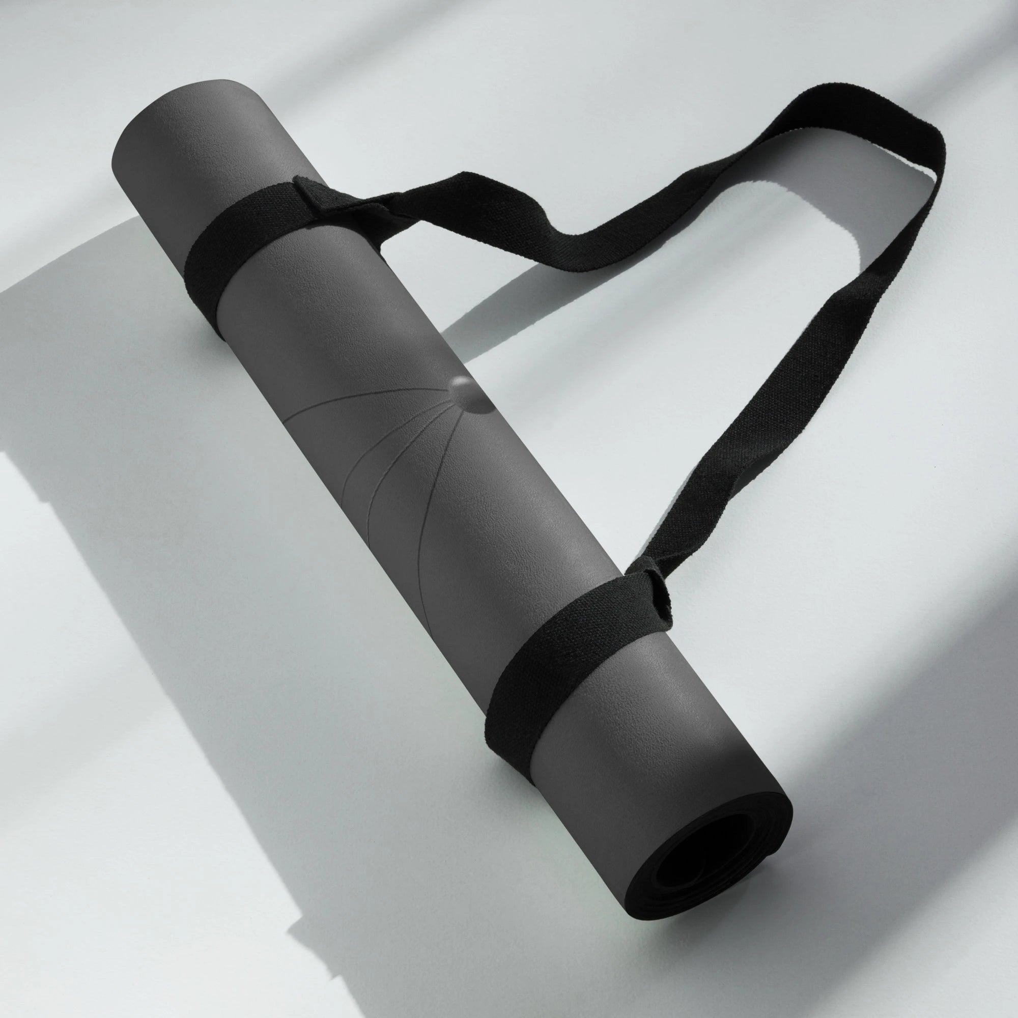 tapis de yoga Athomic Wellness Quantum Grid enroulé avec sangle de transport noire, design géométrique gris